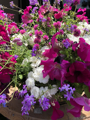 A simple white container has held ten years of spring arrangements. This is the first year I have had success with petunias. In the picture is this is Easy Wave Yellow that I traded seeds with on the seed exchange. In my ongoing war with slugs and snails I continue to try new organic methods. Snails love to eat petunias down to the roots. I don't know if you can see in a couple photographs I have dishes of beer, little plates of yeast and sugar, coffee grounds, egg shells, diatomaceous earth on the surface of pots or on the ground. Many years ago I had a friend who started a snail ranch (escargot) and the buggers always escaped the pen. Please eat escargot.